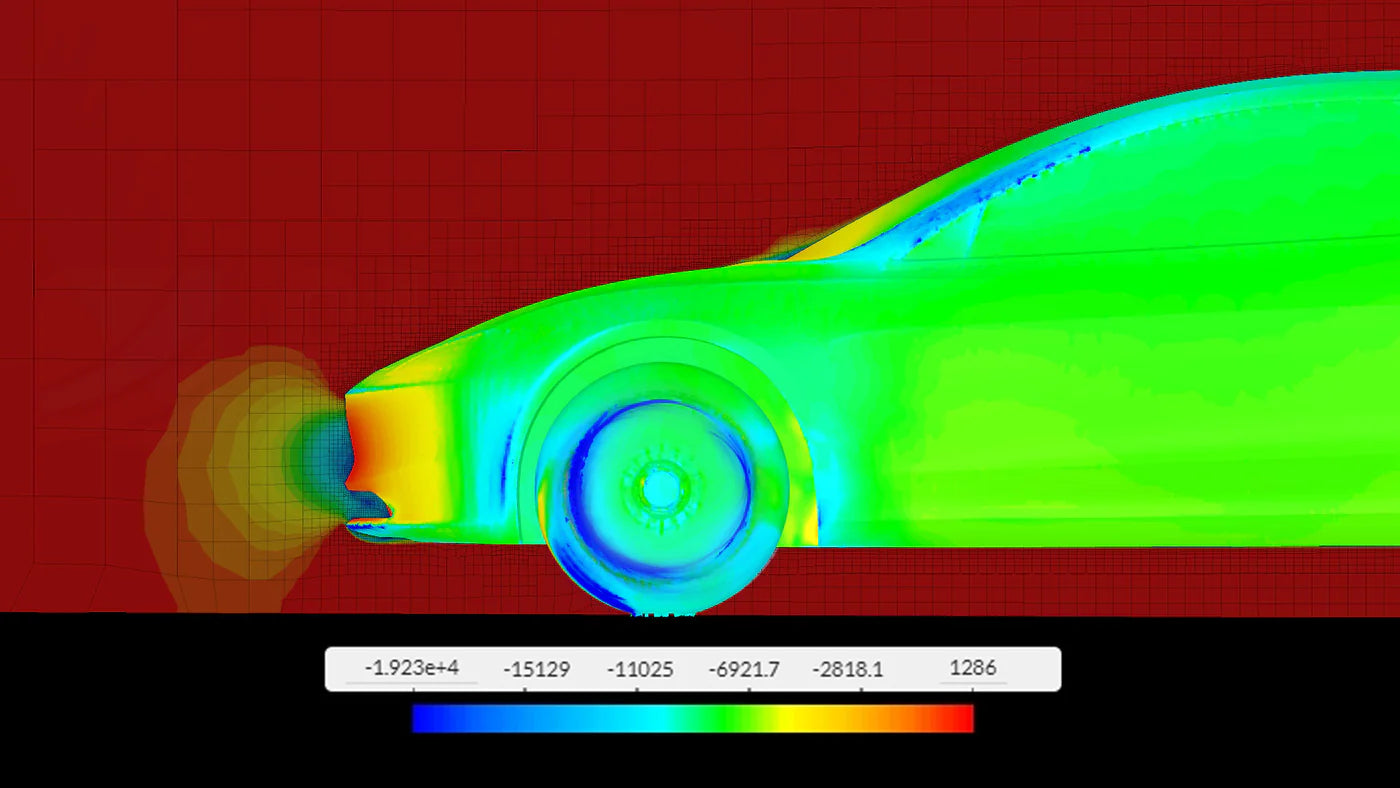 Note: CFD visualization shown under identical conditions and color scale. Results may vary depending on speed, crosswind, tires, and road surface.